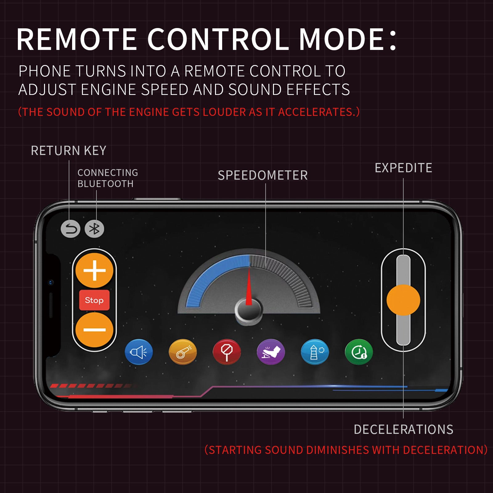 Operate your engine through dedicated mobile application. Control engine startup/shutdown and enjoy realistic sound effects with intuitive smartphone interface.